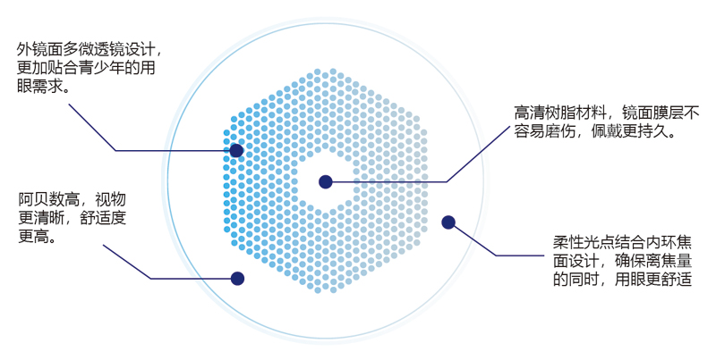 镜片外镜面均匀分布414个独立的"多微透镜",利用近视离焦调节原理,融入镜片的光学设计中,在眼内形成近视离焦信号,以达到调节旁中心远视离焦现象,延缓青少年眼轴拉长,从而有效管理近视发展。