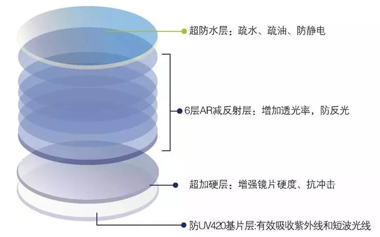 一、蓝光防护 根据光波长和能量变化对眼球的影响,双非全能防蓝光镜片采用纳米级蓝光反射膜层技术,外表面增镀蓝光反射膜层,膜层呈现淡蓝色,当蓝光射入镜片时,反射膜层有效反射有害蓝光,防止有害蓝光进入眼球,保护你的眼睛。