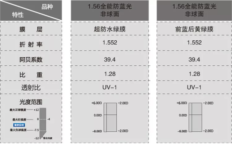 双非球面全能防蓝光镜片参数
